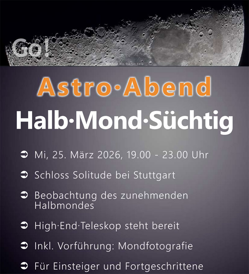 Der Mond im Visier 5. März 2026 • 23.45 Uhr Der nächste Astro⋅Abend steht vor der Tür. Anmeldungen sind noch möglich: ![]() Astro⋅Abend: Halb·Mond·Süchtig: Beobachtung des Halbmondes, Apollo-Landeplätze Mi, 25. März 2026, 19.00 - 23.00 Uhr →Download der Ausschreibung als PDF-Datei Diese Veranstaltung ist auch für Jugendliche geeignet, wenn eine erziehungsberechtigte, erwachsene Person ebenfalls teilnimmt. Bei bedecktem Himmel wird zu entscheiden sein, ob und wann ein Ersatztermin angeboten werden kann. |